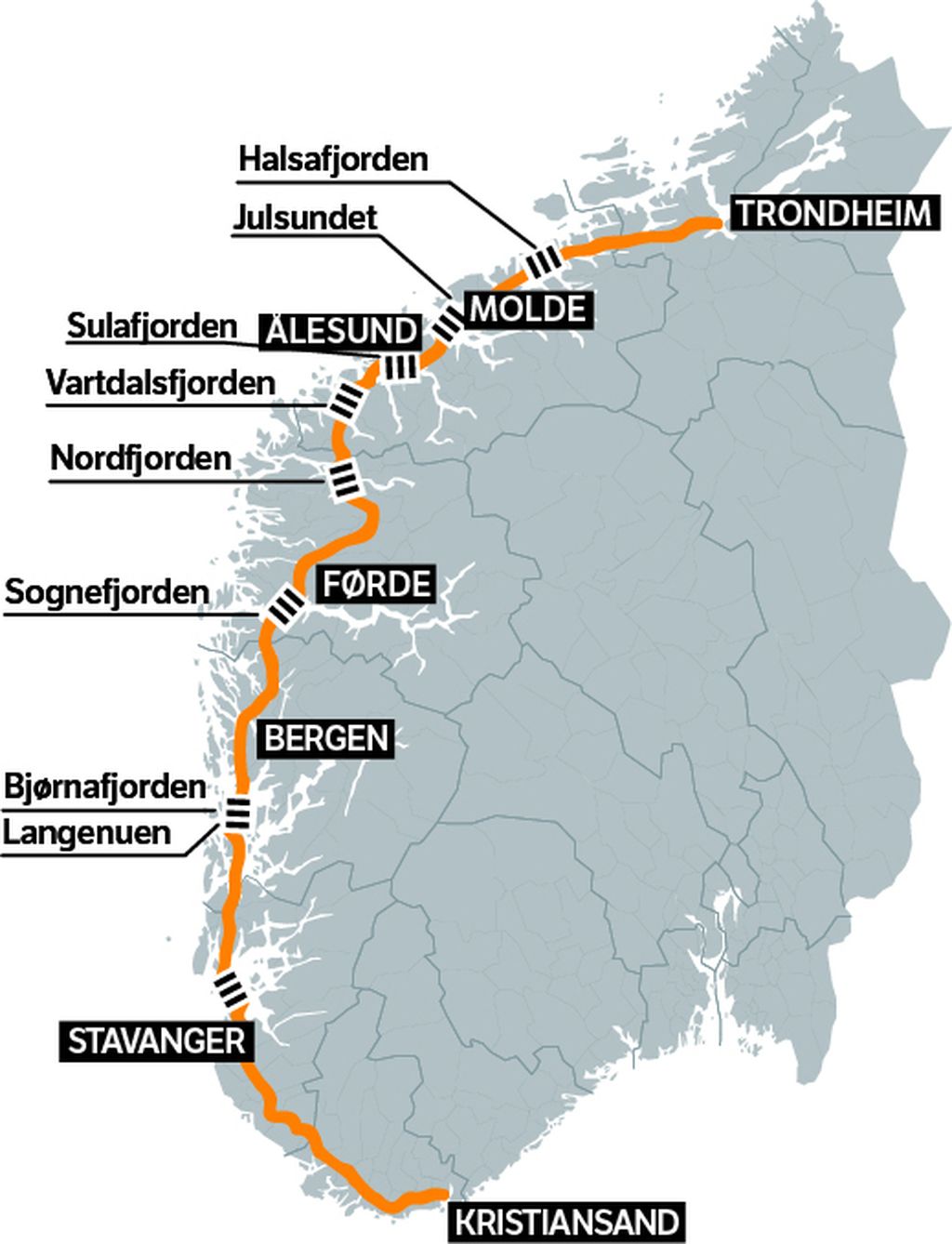Vožnja autocestom E39 zapadnom obalom Norveške pruža nestvarno lijepe prizore od Kristiansanda do Trondheima. Oko 1100 kilometara ceste s pogledom na rijeke i jezera, vodopade, planine i fjordove užitak je za oči. No pogledate li pažljivije kartu, vidjet ćete istočkane linije na sedam fjordova gdje vozači moraju pričekati trajekt kako bi prešli preko. Uz stajanja i prekide, putovanje može trajati i 21 sat.