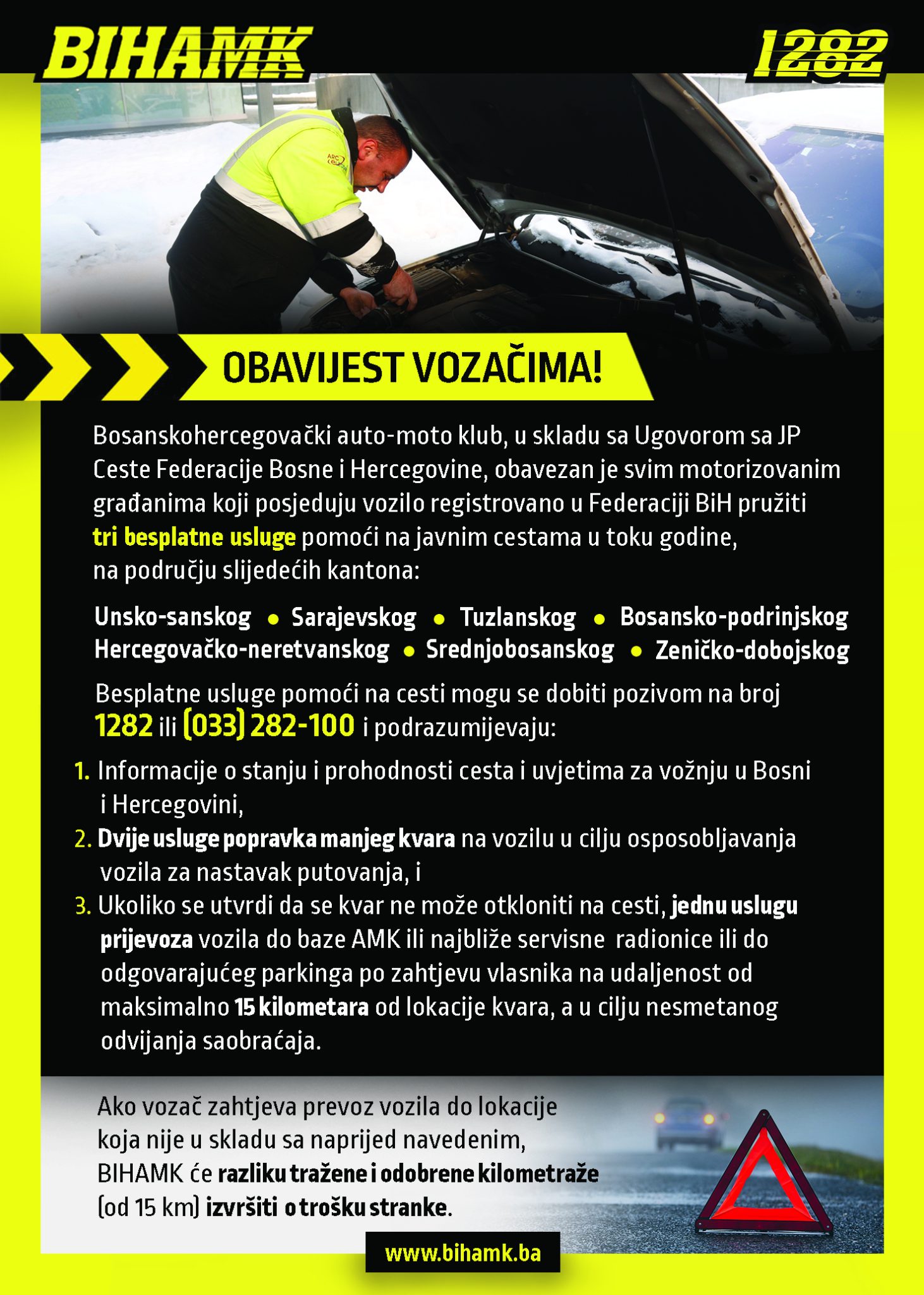 Besplatne usluge pomoći na cesti mogu se dobiti pozivom na broj 1282 ili (033) 282-100 i podrazumijevaju: