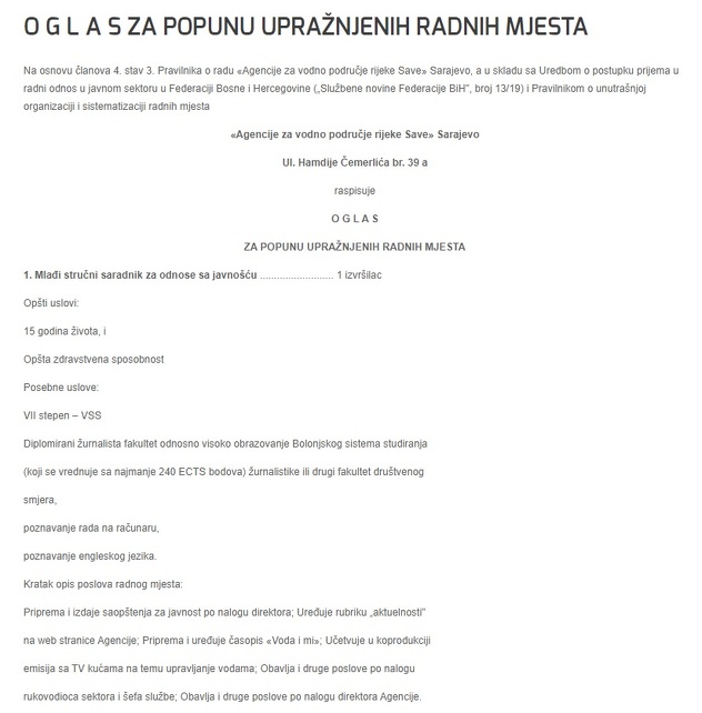 U neobičnom oglasu Agencije za vodno područje rijeke Save je navedeno da je opći uvjet, za oba radna mjesta, da izvršitelj ima napunjenih 15 godina života i da je zdravstveno sposoban.